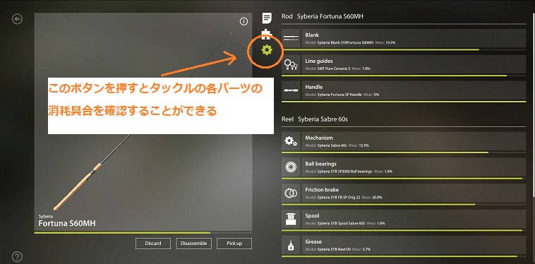 (このゲームでは某Fishing Planetと違い消耗した道具はその具合に応じて徐々に性能が低下する)