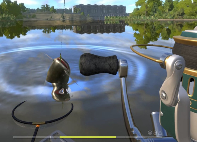 岸やボートに近いところまで魚を引っ張り、「RMB」(右マウスボタン)を押しながらロッドを持ちあげ、「SPACE」を押してランディングネットを取り出してそれで魚をキャッチします。