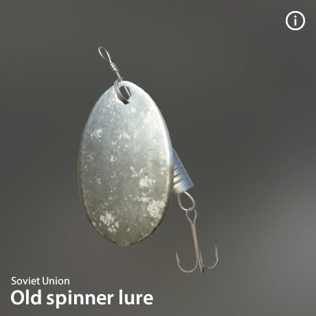 | Old spinner lure | - | - | - | S | 2.50 g | 2.00 g | 4.0 cm | x 1 | 12 - 1/0 | Rusty treble No.6 | Soviet Union |