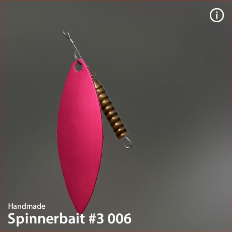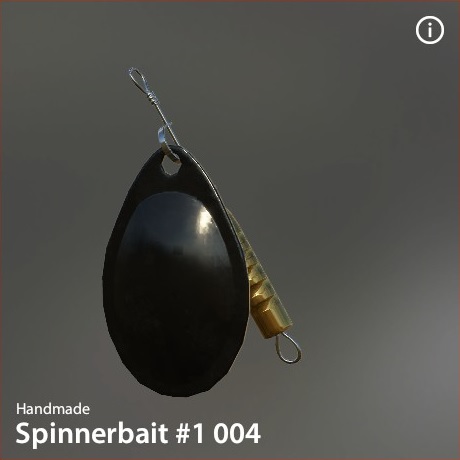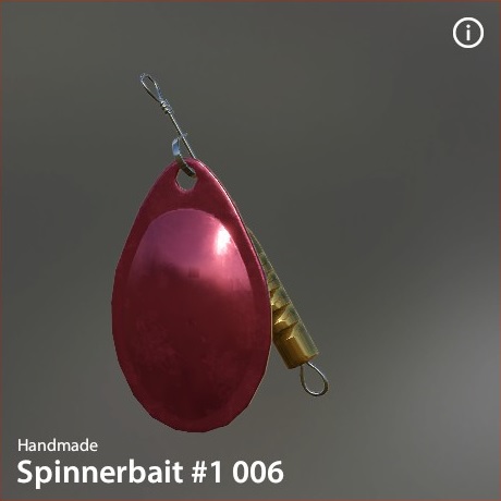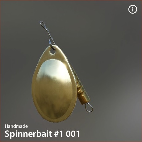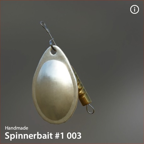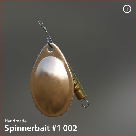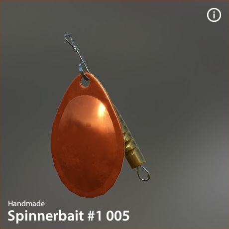 Crafted spinner #1 is a classical spinner. It is intended for using in stillwater or in weak currents. It may be crafted using copper, brass or melchior(alloy). The blade's color matches the natural color of the metal, out of which it was made, however it may be altered by means of chemical regents. The spoon's efficiency depends on the level of its crafting.