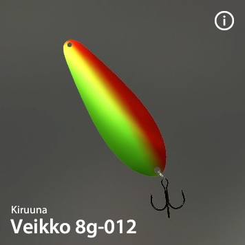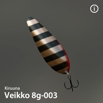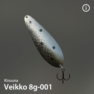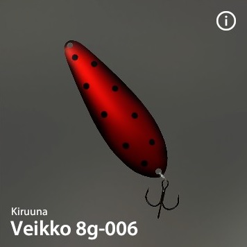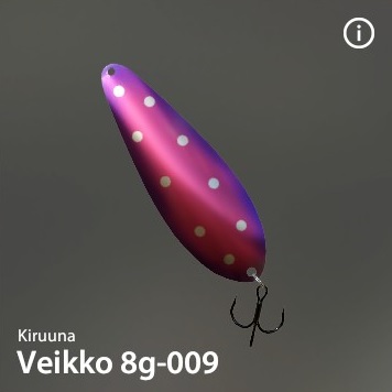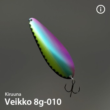 | Veikko 8g | 4.5 | 29.80 | - | S | 8.0 g | . g | 5.0 cm | x 1 | 12 - 1/0 | Rage Treble S4 | Kiruuna |