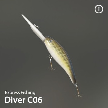 | Diver | 1.5 | 5.40 | - | M | 12.00 g | 8.0 cm | 4.0 m | SP | x 2 | 16 - 2/0 | Express Fishing |