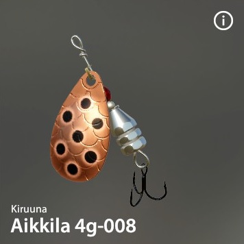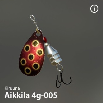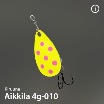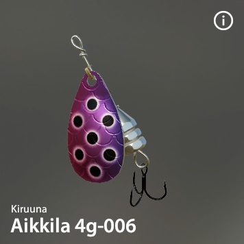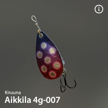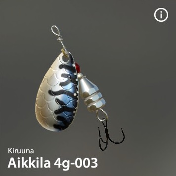 Aikkilaは有名なKiruuna社の伝説的なスピナーです。驚異的な釣果をもたらします。「サーモンキラー」の異名を持つ。このシリーズは様々なカラーと重さで構成されている。ハンドメイド
